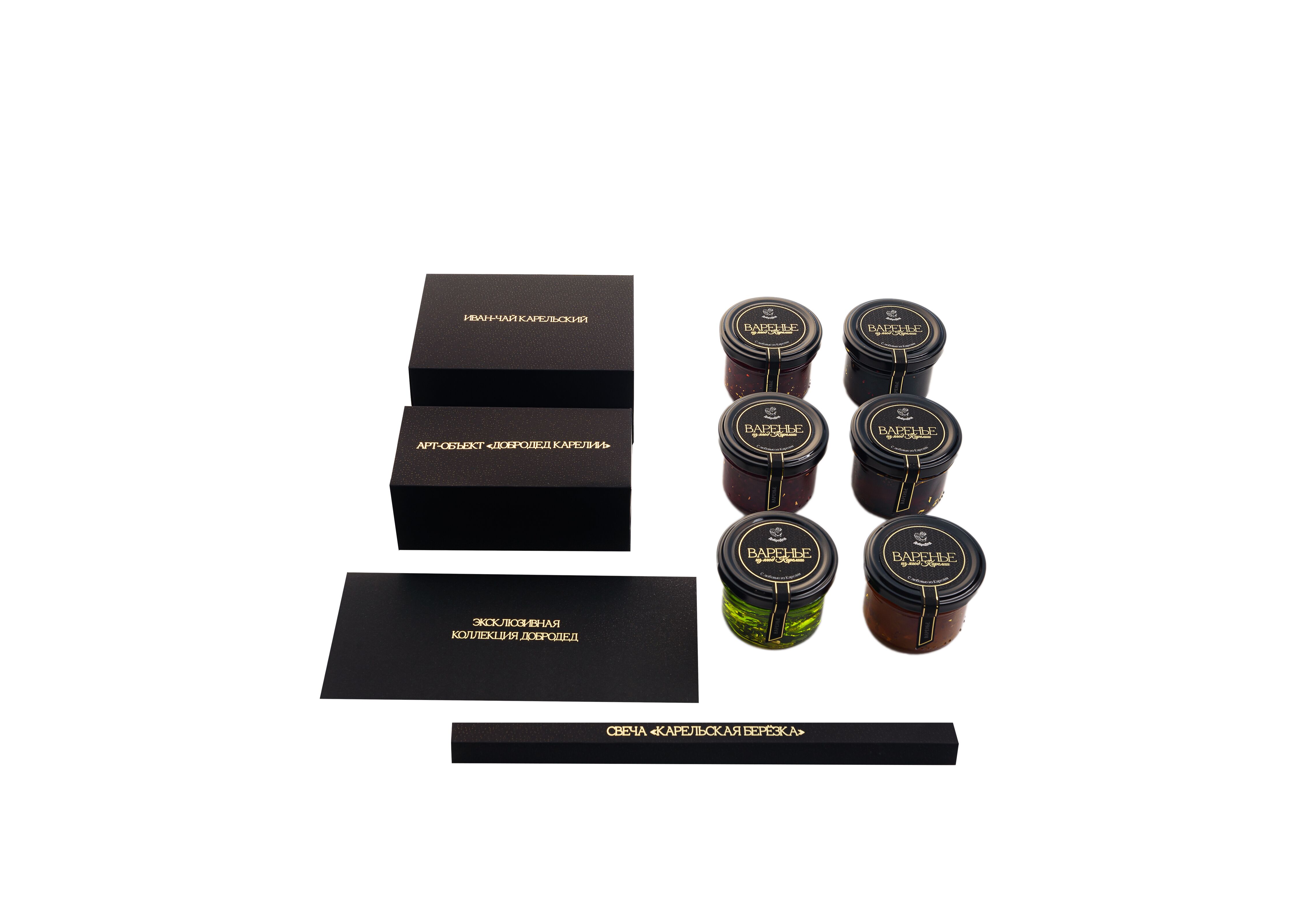 2. Шесть сортов варенья с добавлением сусального золота (по 120 г): Черника, Брусника, Морошка, Сосновые шишки, Мята с хвоей, Малина.